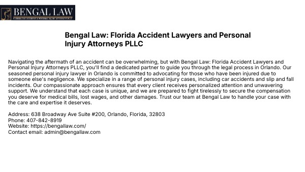 Navigating the aftermath of an accident can be overwhelming, but with Bengal Law: Florida Accident Lawyers and Personal Injury Attorneys PLLC, you'll find a dedicated partner to guide you through the legal process in Orlando. Our seasoned personal injury lawyer in Orlando is committed to advocating for those who have been injured due to someone else's negligence. We specialize in a range of personal injury cases, including car accidents and slip and fall incidents. Our compassionate approach ensures that every client receives personalized attention and unwavering support. We understand that each case is unique, and we are prepared to fight tirelessly to secure the compensation you deserve for medical bills, lost wages, and other damages. Trust our team at Bengal Law to handle your case with the care and expertise it deserves. Address: 638 Broadway Ave Suite #200, Orlando, Florida, 32803Phone: 407-842-8919Website: https://bengallaw.com/Contact email: admin@bengallaw.com