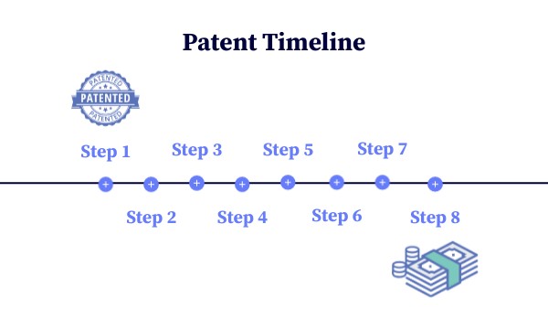 Patents are issued by the USPTO after a thorough and lengthy review of the invention and application. Patents are not immediate and are expensive to obtain and maintain. This timeline demonstrates a simplified version of steps in the patent application process