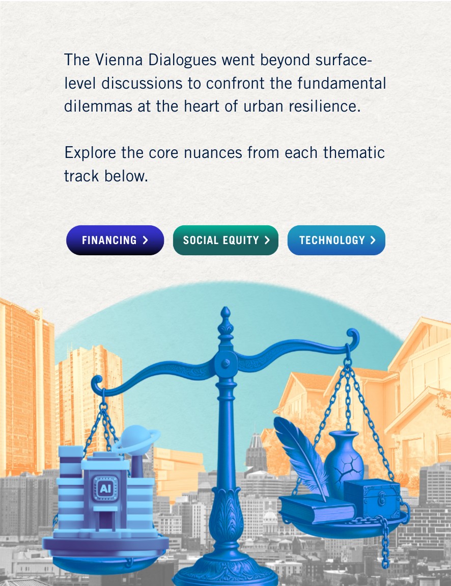 The Vienna Dialogues went beyond surface-level discussions to confront the fundamental dilemmas at the heart of urban resilience. Explore the core nuances from each thematic track below.