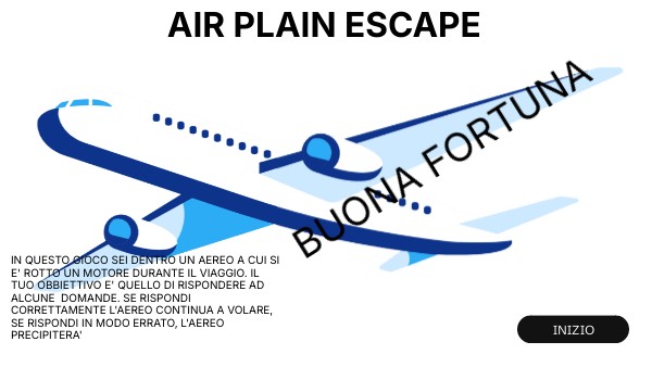 IN QUESTO GIOCO SEI DENTRO UN AEREO A CUI SI E' ROTTO UN MOTORE DURANTE IL VIAGGIO. IL TUO OBBIETTIVO E' QUELLO DI RISPONDERE AD ALCUNE DOMANDE. SE RISPONDI CORRETTAMENTE L'AEREO CONTINUA A VOLARE, SE RISPONDI IN MODO ERRATO, L'AEREO PRECIPITERA'