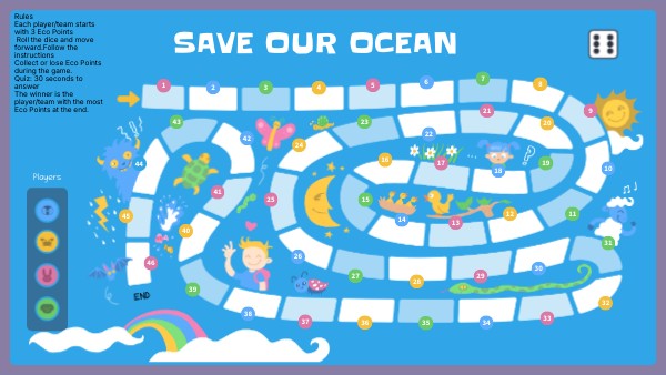 Rules Each player/team starts with 3 Eco Points Roll the dice and move forward.Follow the instructions Collect or lose Eco Points during the game. Quiz: 30 seconds to answer The winner is the player/team with the most Eco Points at the end.