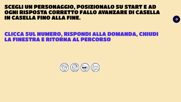 Scegli un personaggio, posizionalO su Start e ad Ogni Risposta corretto fallo avanzare di casella in casella fino alla fine. Clicca sul numero, rispondi alla domanda, Chiudi la finestra e ritorna al percorso