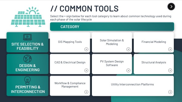 Select the + sign below for each tool category to learn about common technology used during each phase of the solar lifecycle