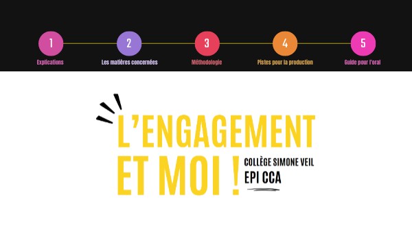 L'intitulé de l'EPI est l'engagement et moi : pour quelle cause serai-je prêt(e) à m'engager ? Dans plusieurs matières au collège vous allez découvrir différentes formes d'engagement à travers l'étude de diverses oeuvres et de faits dus à des personnalités ou artistes engagés pour différentes causes. Les apports de chaque matière vous aideront à comprendre comment se construit une argumentation, ce que représente l'engagement pour une cause et comment un artiste communique son engagement au travers de sa création.À partir de ces apprentissages, vous serez amenés à concevoir un projet d'engagement personnel. Vous devrez choisir une cause à défendre, mener des recherches sur ce thème, puis réaliser une production qui reflète votre engagement.