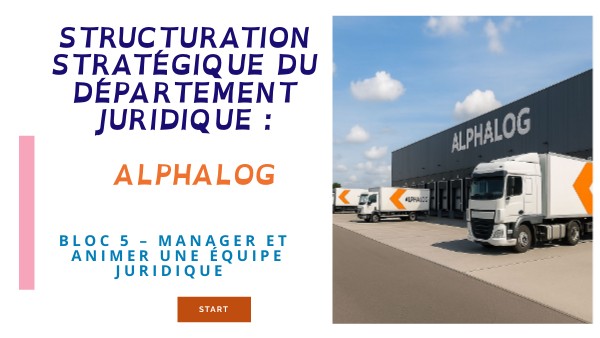 ContexteBloc 5 – Manager et animer une équipe juridique (RNCP 39587) Sujet : Structuration stratégique du département juridique – ALPHALOG Finalité Montrer le rôle stratégique du juriste dans la transformation de l’entreprise Proposer un plan d’action clair et managérial
