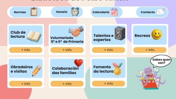 Está sempre presente na nosa biblioteca e nas nosas dinámicas, ademáis será o encargado de notificarlle calquer novidade ao alumnado por carta.Tamén dende o curso pasado nos acompaña a todas as excursións do cole. Os peques quereno moitísimo!