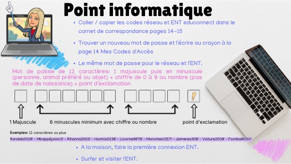 Mot de passe de 12 caractères: 1 majuscule puis en minuscule (personne, animal préféré ou objet) + chiffre de 0 à 9 ou nombre (pas de date de naissance) + point d'exclamation