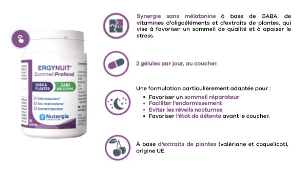 Synergie sans mélatonine à base de GABA, de vitamines d'oligoéléments et d'extraits de plantes, qui vise à favoriser un sommeil de qualité et à apaiser le stress.