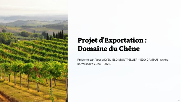 Ce projet vise à renforcer la présence internationale du Domaine du Chêne par une stratégie d'exportation adaptée, axée sur la valorisation de l'image et la construction de relations durables.