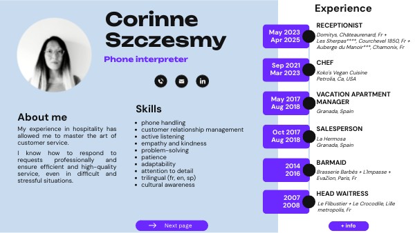 Billing manager | May - Oct 2025 Résidence Domitys, Châteaurenard, Fr Receptionist | Nov 2024 - Apr 2025 Résidence Domitys, Châteaurenard, Fr Virtual assistant | since Sep 2024 Koko Assist', remote Receptionist | Dec 2023 - Apr 2024 Hôtel**** Les Sherpas, Courchevel 1850, Fr Receptionist | May - Nov 2023 Hôtel*** Auberge du Manoir, Chamonix, Fr Internet assessor | Sep 2018 - Jul 2021 Appen, remote Executive assistant | Apr 2009 - Feb 2010 MJC du Virolois, Tourcoing, Fr
