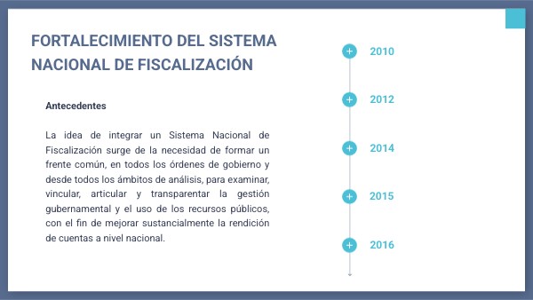 Antecedentes La idea de integrar un Sistema Nacional de Fiscalización surge de la necesidad de formar un frente común, en todos los órdenes de gobierno y desde todos los ámbitos de análisis, para examinar, vincular, articular y transparentar la gestión gubernamental y el uso de los recursos públicos, con el fin de mejorar sustancialmente la rendición de cuentas a nivel nacional.