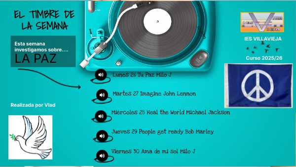 Esta semana trata de la paz, la paz que sientes con tius seres queridos o la novia, la paz del mundo o en general, el término paz. El dia de la paz se celebra el 30 de enero. Una curiosidad es que El 30 de enero de 1948 Mahatma Gandhi, principal figura de la no violencia y la resistencia pacífica en el mundo, fue asesinado. Por este motivo, cada 30 de enero, desde 1964, en el Hemisferio Norte se conmemora el Día Escolar de la Paz y la No Violencia.