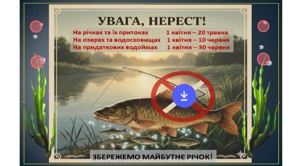 Нерест — це період, коли риба відкладає ікру. Будь-яке втручання або вилов у цей час різко зменшує кількість риби у водоймах. Заборона рибної ловлі в період нересту (весняно-літній період) запроваджується для забезпечення спокійного розмноження риби, відновлення її популяцій та збереження водних біоресурсів. У цей час риба вразлива, тому обмеження дозволяють їй відкласти ікру, що критично для підтримки чисельності популяції. Рибалити дозволено лише з берега, за межами нерестовищ, вудочками (до 2 гачків) або спінінгом (1 приманка) у межах добової норми (до 3 кг + 1 трофей).