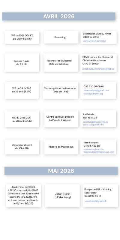 Jeudi 7 mai de 19h30 à 21h30 - accueil dès 19h15 (s’inscrire à une autre soirée parmi 8/1, 12/2, 12/03, 11/6et à une messe des fiancés le 15/2 ou 9/5/26)