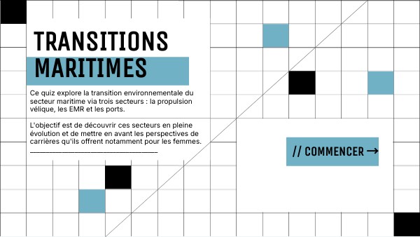 Ce quiz explore la transition environnementale du secteur maritime via trois secteurs : la propulsion vélique, les EMR et les ports. L'objectif est de découvrir ces secteurs en pleine évolution et de mettre en avant les perspectives de carrières qu'ils offrent notamment pour les femmes. ________________________________________