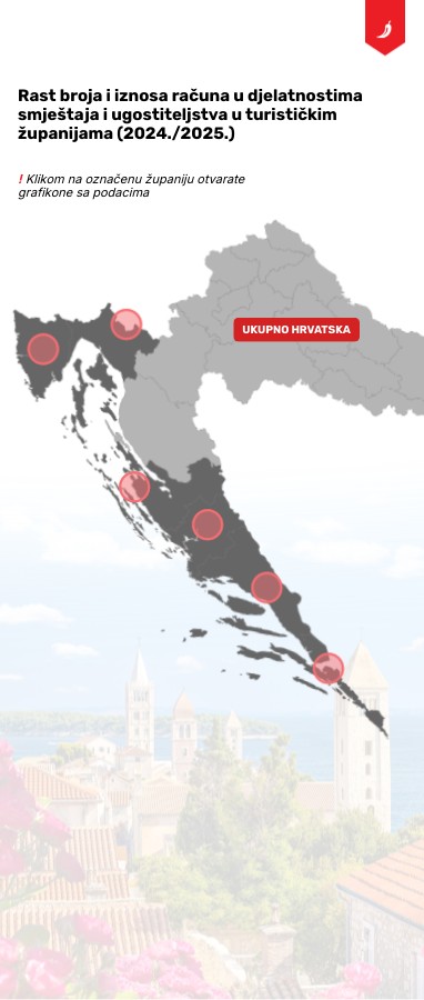 Rast broja i iznosa računa u djelatnostima smještaja i ugostiteljstva u turističkim županijama (2024./2025.)