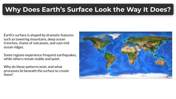 Earth’s surface is shaped by dramatic features such as towering mountains, deep ocean trenches, chains of volcanoes, and vast mid-ocean ridges. Some regions experience frequent earthquakes, while others remain stable and quiet. Why do these patterns exist, and what processes lie beneath the surface to create them?