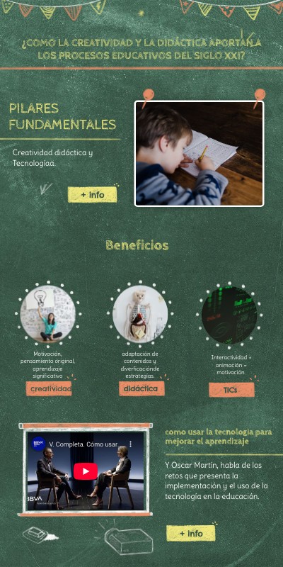 La creatividad y la didáctica son fundamentales en la educación actual. La creatividad estimula la imaginación y el pensamiento original, mientras que la didáctica adapta la enseñanza a las necesidades individuales. la tecnología ayuda a hacer que las brechas de tiempo y acceso al conocimiento disminuyan, Combinadas, promueven el aprendizaje activo, el pensamiento crítico y la resolución de problemas. Preparan a los estudiantes para enfrentar los desafíos del siglo XXI y desarrollar habilidades relevantes.
