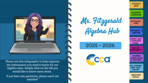 Please use this infographic to help organize the information you need to know for our Algebra class. Simply click on the tab you would like to know more about. If you have any questions, please reach out anytime!