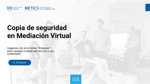 - METICS no guarda copias de seguridad de ningún entorno virtual, por lo que es responsabilidad de cada docente, guardar en medios externos a su entorno virtual las copias de respaldo.