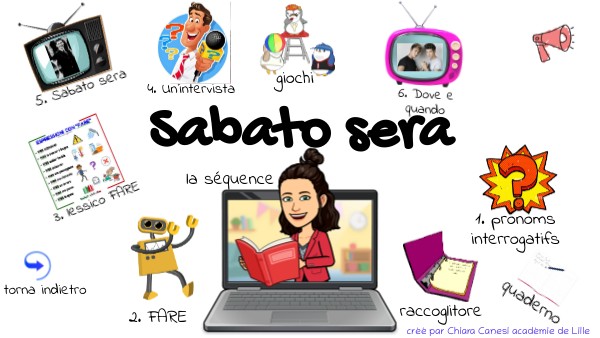 SEQUENCE 1 : SABATO SERA - 1. LESSICO : les jours de la semaine, les moments de la journée, les verbes, les couleurs - 2. VIDEO --> Chanson Sabato Sera, Bruno Filippini, 1964 - 3. Un'intervista : Che cosa pensi del sabato sera? - 4. VIDEO --> Chanson Dove e quando Benji e Fede, 2019 - 5. Ritratto di Nonno e nipote - GRAMMATICA : le verbe FARE au présent de l'indicatif, les pronoms personnels sujet, les pronoms interrogatifs, les verbes réguliers au présent de l'indicatif.