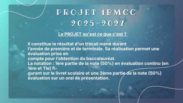 Le PROJET qu'est ce que c'est ? Il constitue le résultat d’un travail mené durant l’année de première et de terminale. Sa réalisation permet une évaluation prise en compte pour l’obtention du baccalauréat. La notation : 1ère partie de la note (50%) en évaluation continu (en 1ère et Tle) fi- gurant sur le livret scolaire et une 2ème partie de la note (50%) évaluation sur un oral de présentation.