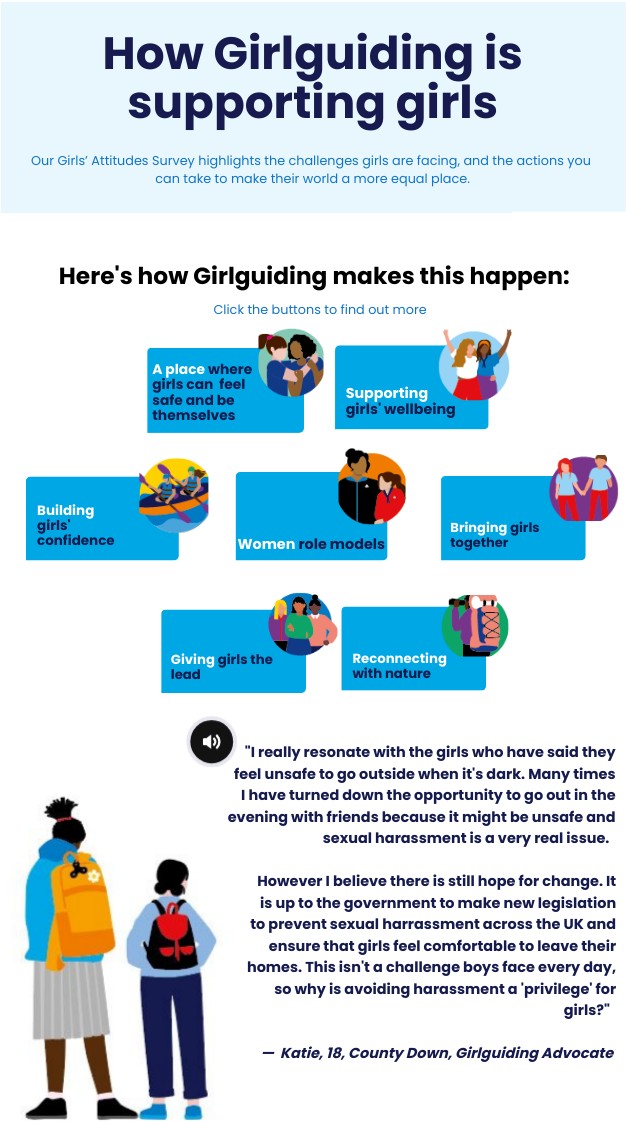 However I believe there is still hope for change. It is up to the government to make new legislation to prevent sexual harrassment across the UK and ensure that girls feel comfortable to leave their homes. This isn't a challenge boys face every day, so why is avoiding harassment a 'privilege' for girls?" — Katie, 18, County Down, Girlguiding Advocate