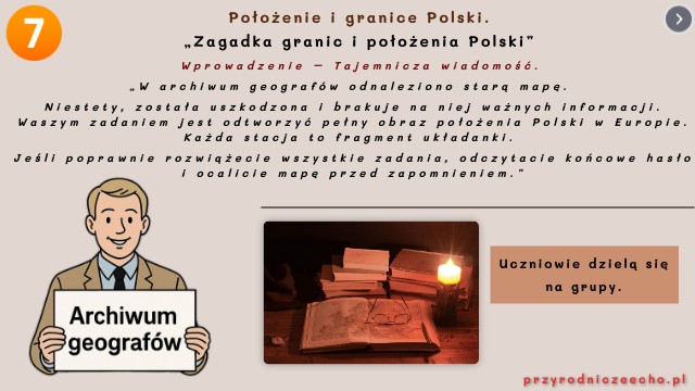Uczniowie odnajdują sens uzyskanego hasła. Nauczyciel otwiera ostatnią kopertę z napisem „Archiwum Geografów”. W środku znajduje się: stara mapa (wydrukowana, np. konturowa Europy z zaznaczoną Polską), list od „Strażnika Mapy”.