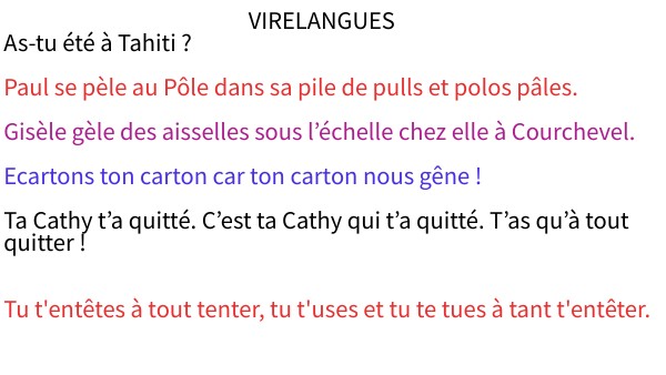 VIRELANGUES As-tu été à Tahiti ? Paul se pèle au Pôle dans sa pile de pulls et polos pâles. Gisèle gèle des aisselles sous l’échelle chez elle à Courchevel. Ecartons ton carton car ton carton nous gêne ! Ta Cathy t’a quitté. C’est ta Cathy qui t’a quitté. T’as qu’à tout quitter ! Tu t'entêtes à tout tenter, tu t'uses et tu te tues à tant t'entêter.