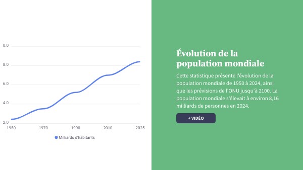 Cette statistique présente l'évolution de la population mondiale de 1950 à 2024, ainsi que les prévisions de l'ONU jusqu'à 2100. La population mondiale s'élevait à environ 8,16 milliards de personnes en 2024.