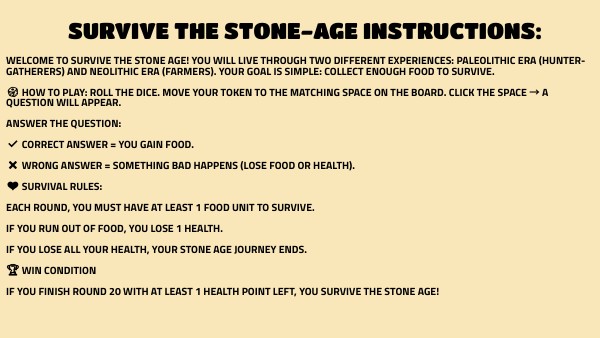 Welcome to Survive the Stone Age! You will live through two different experiences: Paleolithic Era (Hunter-Gatherers) and Neolithic Era (Farmers). Your goal is simple: collect enough food to survive. 🎲 How to Play: Roll the dice. Move your token to the matching space on the board. Click the space → a question will appear. Answer the question: ✅ Correct answer = you gain food. ❌ Wrong answer = something bad happens (lose food or health). ❤️ Survival Rules: Each round, you must have at least 1 food unit to survive. If you run out of food, you lose 1 health. If you lose all your health, your Stone Age journey ends. 🏆 Win Condition If you finish Round 20 with at least 1 health point left, you survive the Stone Age!