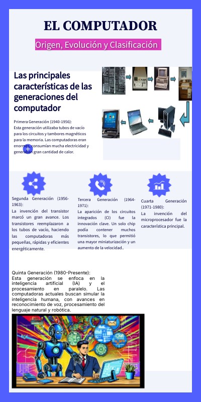 Quinta Generación (1980-Presente): Esta generación se enfoca en la inteligencia artificial (IA) y el procesamiento en paralelo. Las computadoras actuales buscan simular la inteligencia humana, con avances en reconocimiento de voz, procesamiento del lenguaje natural y robótica.
