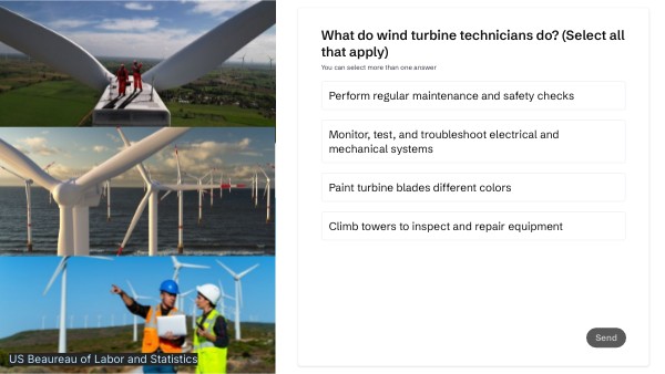 You got it!Wind techs spend most of their time climbing tall towers and working hands-on with equipment outdoors, not in a control room.