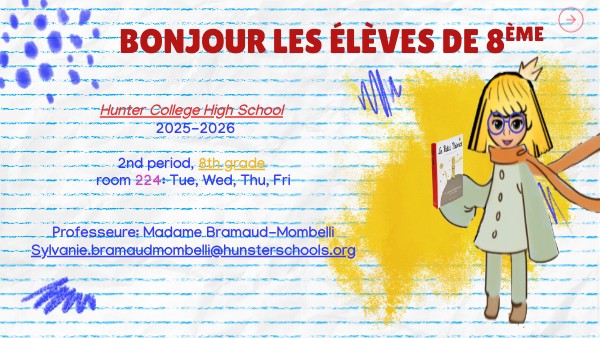 Hunter College High School 2025-2026 2nd period, 8th grade room 224: Tue, Wed, Thu, Fri Professeure: Madame Bramaud-Mombelli Sylvanie.bramaudmombelli@hunsterschools.org