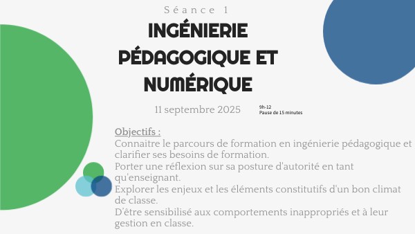 Objectifs : Connaitre le parcours de formation en ingénierie pédagogique et clarifier ses besoins de formation. Porter une réflexion sur sa posture d'autorité en tant qu'enseignant. Explorer les enjeux et les éléments constitutifs d'un bon climat de classe. D’être sensibilisé aux comportements inappropriés et à leur gestion en classe.