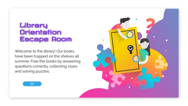 Welcome to the library! Our books have been trapped on the shelves all summer. Free the books by answering questions correctly, collecting clues, and solving puzzles.