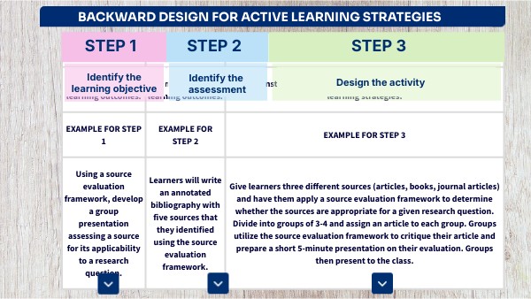 Select the assessment that will demonstrate your learning objective. The active learning activity should require students to practice for the assessment, which is an annotated bibliography.