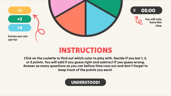 Click on the roulette to find out which color to play with. Decide if you bet 1, 2, or 3 points. You will add if you guess right and subtract if you guess wrong. Answer as many questions as you can before time runs out and don't forget to keep track of the points you earn!