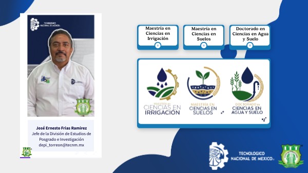 Dr. Jose Ernesto Frias dpi_torreon@tecnm.mx TEL. (871) 253 3957 Ext. 112 Pablo Yescas Coronado Coordinador de la Maestría en Ciencias en Irrigación pablo.yc@torreon.tecnm.mx