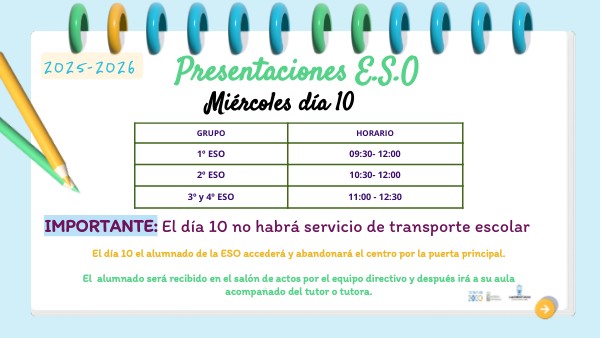 El día 10 el alumnado de la ESO accederá y abandonará el centro por la puerta principal. El alumnado será recibido en el salón de actos por el equipo directivo y después irá a su aula acompañado del tutor o tutora.