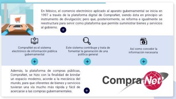 En México, el comercio electrónico aplicado al aparato gubernamental se inicia en 1997 a través de la plataforma digital de CompraNet, siendo ésta en principio un instrumento de divulgación; pero que, posteriormente, se reforma e igualmente se reestructura para servir como plataforma que permite suministrar bienes y servicios al gobierno.