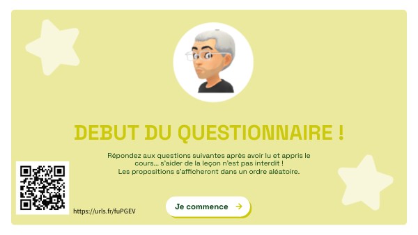 Répondez aux questions suivantes après avoir lu et appris le cours... s'aider de la leçon n'est pas interdit ! Les propositions s'afficheront dans un ordre aléatoire.