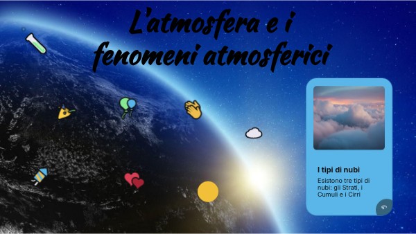 I Cirri: Sono nuvole alte, piccole e allungate.I Cumuli: Sono nuvole molto grandi e non permettono il passaggio dei raggi del sole. Gli Strati: Sono nuvole basse, coprono tutto il cielo e spesso riducono la luce solare.