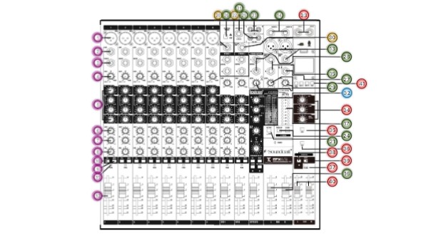 13. Salidas de mezcla (XLR) & salida mono (1⁄4” Jack)