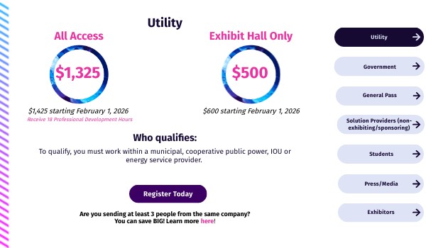 The Government pass is for policymakers, regulators, and professionals from local, state/provincial, federal, or military government agencies.