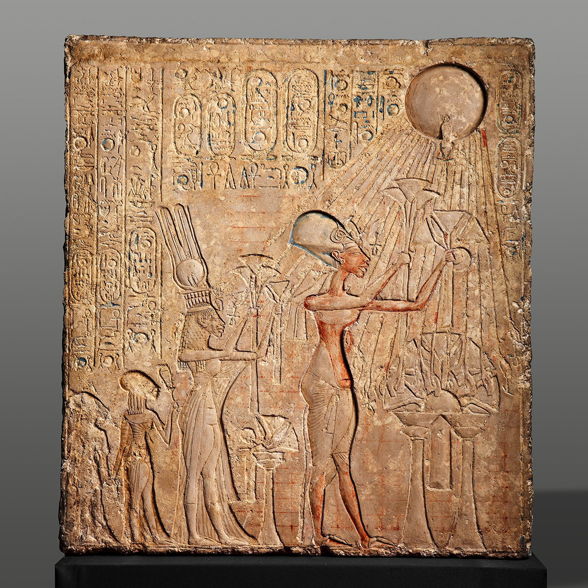 The object shown connects to our weekly module, as it shows imagery from the Amarna Revolution. This art piece depicts Pharoah Akhenaten, his queen and wife Nefertiti (both wearing their royal head-dresses), and their 2 children worshipping the god Aten, holding up what seem to be lotus flowers in offering. In Ancient Egypt, lotus flowers represent divine beauty and creation. Aten, who is being represented as the sun, as he is the god of life and creation, was the primary god that the Pharoah recognized, creating the religion of Atenism around him. What was so different about Atenism was that the religion was monotheistic, meaning that it only worshipped the one god Atens, while before this Egypt had always been a polythesistic region, worshipping many different famous gods such as Ra, Anubis, and Osiris, making the Egyptian public resent the new religion. This art piece was most likely created to promote the religion of Atenism to the public. Having the leader and closest thing to a god on earth, their pharoah, worshipping with his family was most likely a way to get the conversion from a long reigning polythestic religious system to an all new monothestic one as smooth as possible.