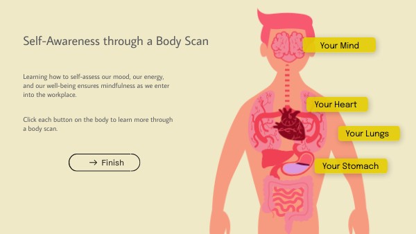 Learning how to self-assess our mood, our energy, and our well-being ensures mindfulness as we enter into the workplace. Click each button on the body to learn more through a body scan.