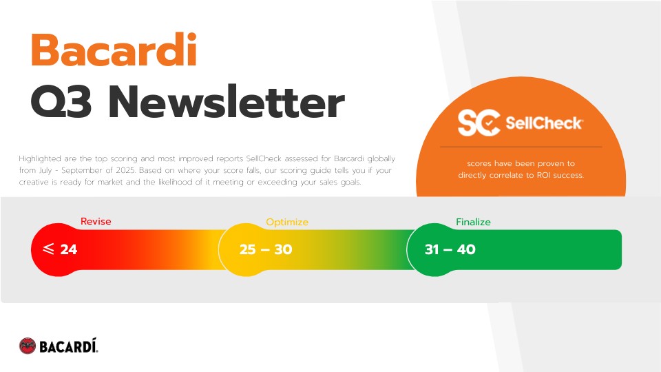 Highlighted are the top scoring and most improved reports SellCheck assessed for Barcardi globally from July - September of 2025. Based on where your score falls, our scoring guide tells you if your creative is ready for market and the likelihood of it meeting or exceeding your sales goals.