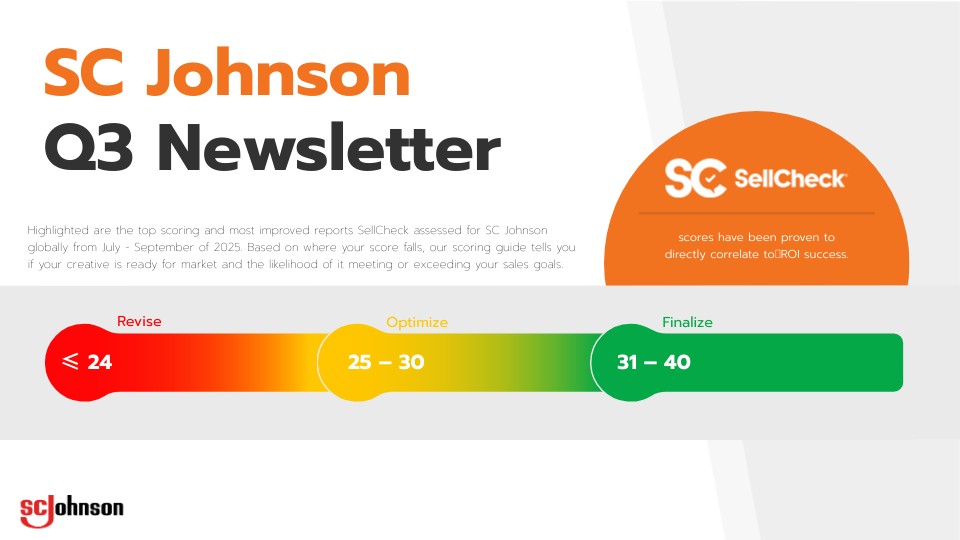 Highlighted are the top scoring and most improved reports SellCheck assessed for SC Johnson globally from July - September of 2025. Based on where your score falls, our scoring guide tells you if your creative is ready for market and the likelihood of it meeting or exceeding your sales goals.