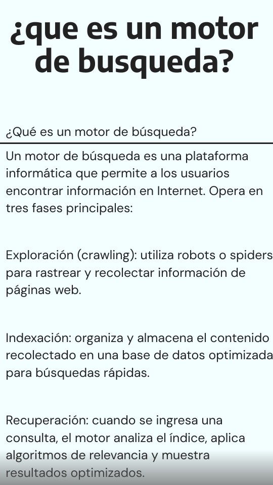 ¿Qué es un motor de búsqueda? Un motor de búsqueda es una plataforma informática que permite a los usuarios encontrar información en Internet. Opera en tres fases principales: Exploración (crawling): utiliza robots o spiders para rastrear y recolectar información de páginas web. Indexación: organiza y almacena el contenido recolectado en una base de datos optimizada para búsquedas rápidas. Recuperación: cuando se ingresa una consulta, el motor analiza el índice, aplica algoritmos de relevancia y muestra resultados optimizados.